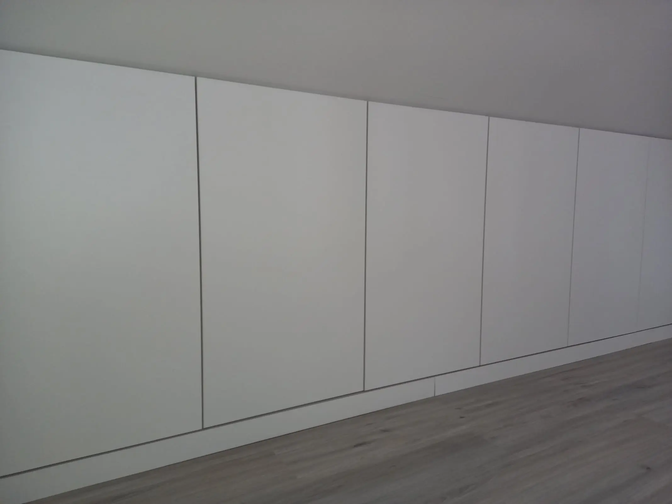 Roupeiro - 'Solução para Sótão''Solução para Sótão', um roupeiro cuidadosamente projetado para otimizar o espaço do seu sótão. Com acabamento em melamina branca e portas de correr.